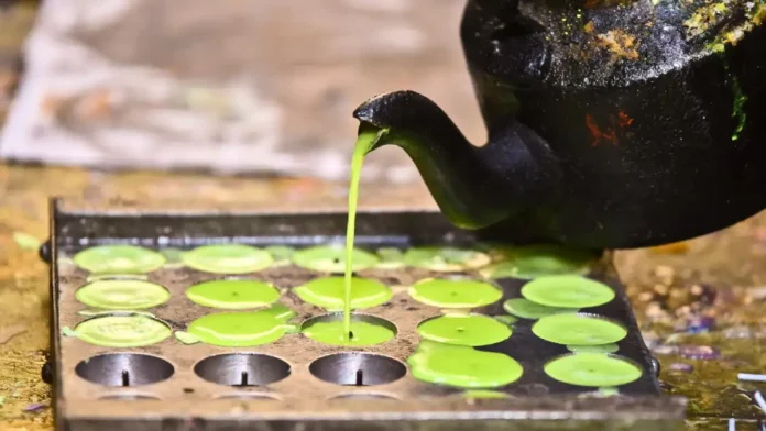 কারখানায় তরল মোমবাতি ঢালা হচ্ছে ছাঁচে।