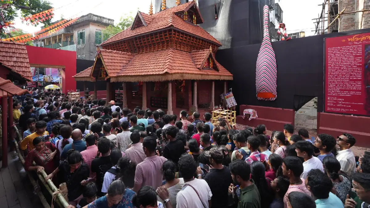 দক্ষিণ কলকাতায় রাসবিহারী মোড়ের কাছে ৬৬ পল্লির পুজো এবার ৭৫ বছরে পড়ল। এ বছর এই পুজোর থিম হল ‘শক্তিপূজা – দ্য মিস্টিক ডিভাইন’। এ টুকরো কেরল কলকাতার বুকে। পুজোমণ্ডপে দেখা যাচ্ছে কেরলের ঐতিহ্যবাহী লোকশিল্প, যার নাম ‘থেইয়াম’। দেবীপ্রতিমাও এই থিমের সঙ্গে সামঞ্জস্য রেখে তৈরি করা। ছবি: রাজীব বসু