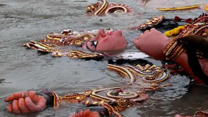 সিঁদুরখেলা সাঙ্গ হলে শুরু হয়ে যায় বিসর্জনের প্রস্তুতি। বিকেল থেকেই শুরু হয়ে গিয়েছে বিসর্জন। মহানগরীর বিসর্জনপর্ব মূলত গঙ্গার ঘাটে সম্পন্ন হলেও, শহরতলি এলাকায় বিভিন্ন ঝিলে, জলাশয়ে চলছে বিসর্জন।