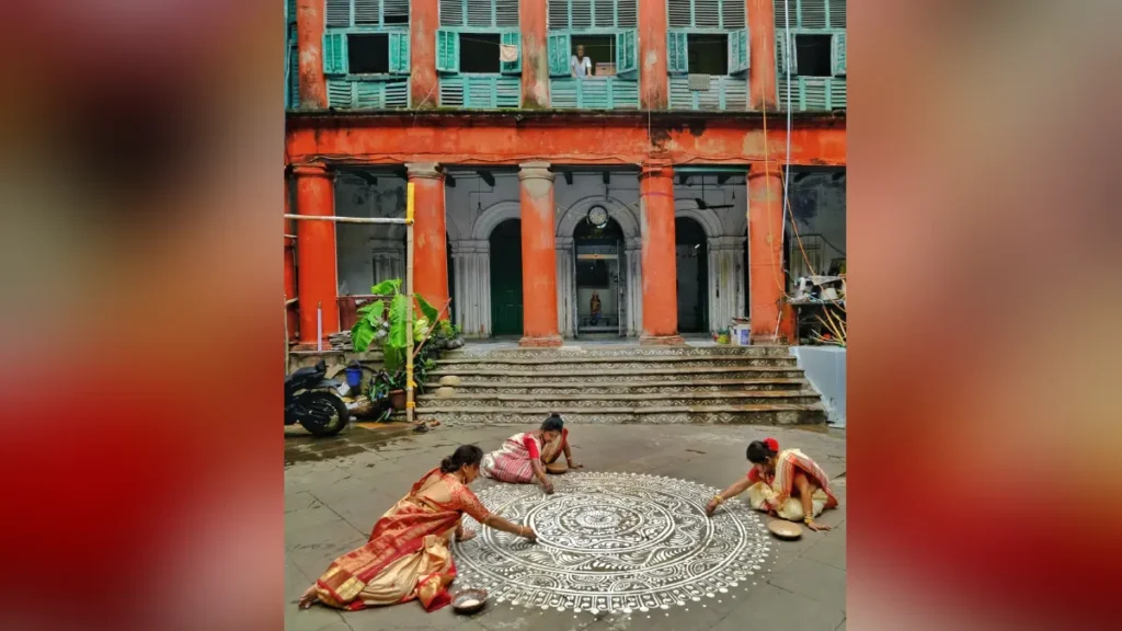 লক্ষ্মীপুজো উপলক্ষে কলকাতার একটি বনেদী বাড়ির উঠানে আলপনা দেওয়া চলছে।