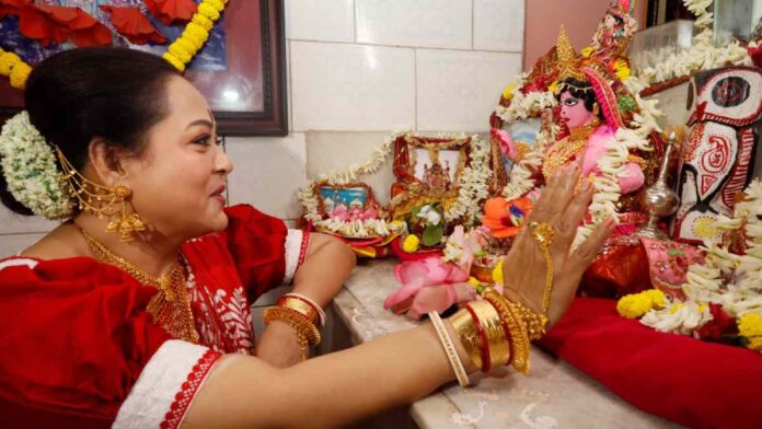 সোমবার সকাল থেকে ভবানীপুরের চট্টোপাধ্যায় বাড়ির লক্ষ্মীপুজোয় ব্যস্ত অভিনেতা গৌরব চট্টোপাধ্যায় ও দেবলীনা কুমার। এই পুজো উত্তমকুমারের পুজো নামে খ্যাত।