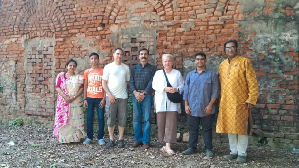 সাবর্ণ সংগ্রহশালা পরিদর্শনে তিন অতিথির সঙ্গে রয়েছেন সাবর্ণ রায় চৌধুরী পরিবার পরিষদের সম্পাদক দেবর্ষি রায় চৌধুরী (ডান দিকে) এবং সুচরিতা রায় চৌধুরী (বাঁ দিকে)।
