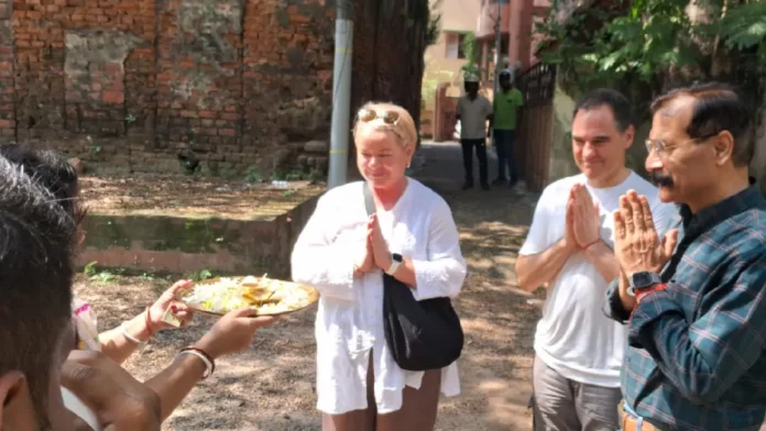 সাবর্ণ সংগ্রহশালা পরিদর্শনে তিন অতিথির সঙ্গে রয়েছেন সাবর্ণ রায় চৌধুরী পরিবার পরিষদের সম্পাদক দেবর্ষি রায় চৌধুরী (ডান দিকে) এবং সুচরিতা রায় চৌধুরী (বাঁ দিকে)।