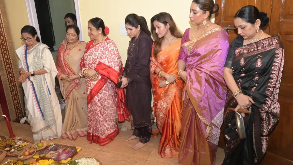 প্রতিবারের মতো এবারও মুখ্যমন্ত্রীর কালীঘাটের বাড়ির পুজোয় হাজির হন রাজ্য সরকারের আমলা-পুলিশকর্তা-মন্ত্রী-বিধায়ক-কাউন্সিলারেরা। টলিউডের তারকাও সেই তালিকা থেকে বাদ যাননি।