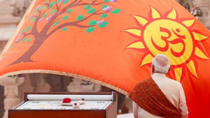 অযোধ্যার রামমন্দিরে ধ্বজারোহণ অনুষ্ঠানে ভারতকে ‘বিকশিত ভারত’-এর পথে এগিয়ে নেওয়ার সংকল্প ঘোষণা করলেন প্রধানমন্ত্রী নরেন্দ্র মোদী। স্বাধীনতার শতবর্ষ পূর্তির আগেই অর্থাৎ ২০৪৭ সালের মধ্যেই রামরাজ্যের আদলে উন্নত ভারত গড়ে তোলার লক্ষ্য নিয়েছেন বলে জানান তিনি।