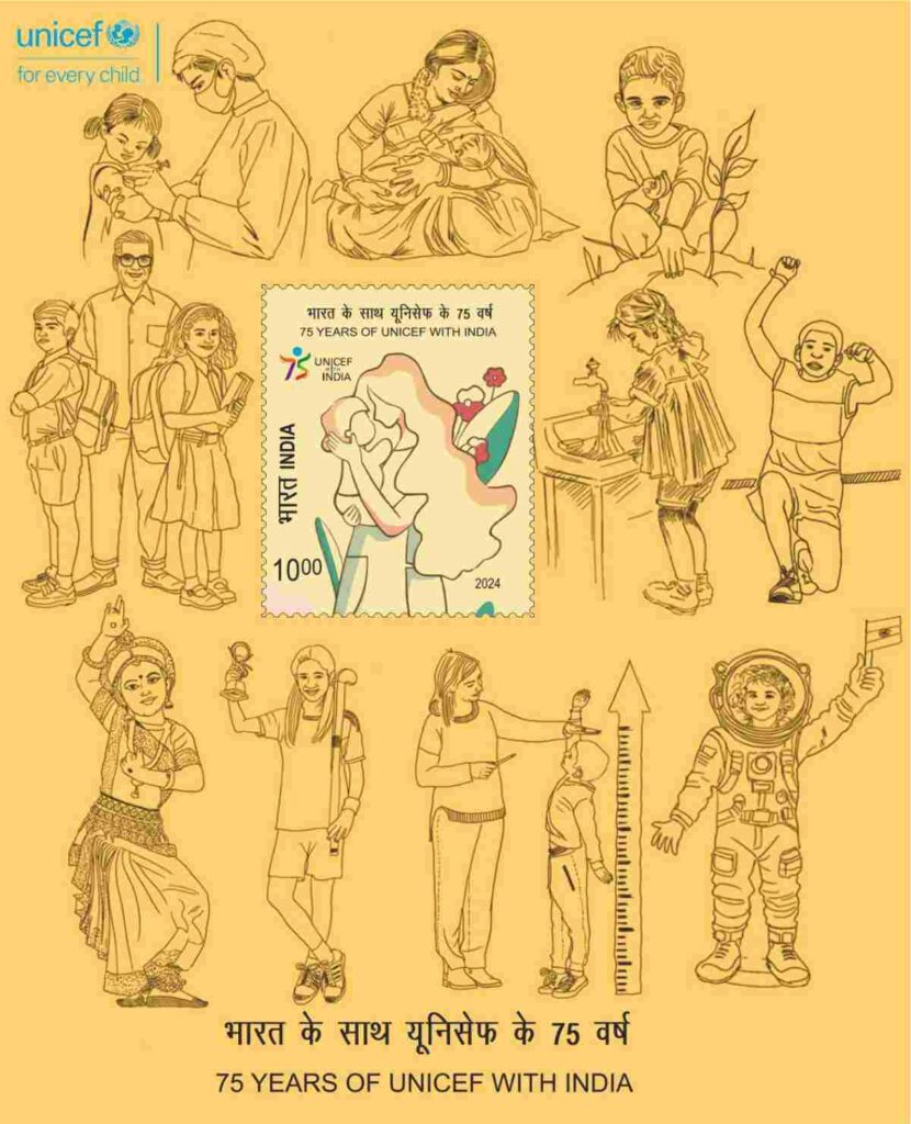 শিশুদের অধিকার রক্ষায় ইউনিসেফের ভারতবর্ষে কাজের পঁচাত্তর বছর পূর্তি উপলক্ষে স্মারক ডাকটিকিট প্রকাশ করেছে ভারতীয় ডাক বিভাগ। দশ টাকা মূল্যের এই ডাকটিকিটে মায়ের কোলে এক শিশুর ছবি প্রদর্শিত হয়েছে, যা প্রতিটি শিশুর বেঁচে থাকা, বিকাশের সুযোগ এবং জীবনের পূর্ণতা অর্জনের অধিকারকে প্রতিফলিত করে।