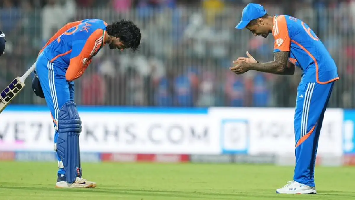 জয়ের জন্য ভারতকে করতে হবে ১৬৬ রান। তারা শুরুও করেছিল ভালোই। ১৯ রানের মধ্যে অভিষেক শর্মা ও সঞ্জু স্যামসনকে ফেরত পাঠিয়ে দিয়েছিল। কিন্তু তৃতীয় উইকেটের জুটিতে বাদ সাধলেন তিলক বর্মা এবং অধিনায়ক সূর্যকুমার যাদব। তবে ভারতের দুর্ভাগ্য। দলের ৫৮ রানে সূর্যকুমার ব্রাইটন কার্সের বলে বোল্ড হতেই অল্প রানের মধ্যে ভারত আরও ২ উইকেট হারাল। ফিরে গেলেন ধ্রুব জুরেল (৫ বলে ৪ রান এবং হার্দিক পাণ্ড্য (৬ বলে ৭ রান)।