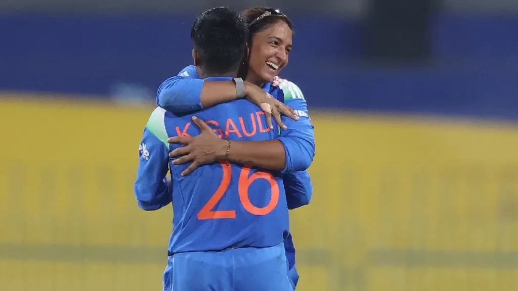 ‘প্লেয়ার অফ দ্য ম্যাচ’ ক্রান্তি গৌড়কে জড়িয়ে ধরলেন অধিনায়ক। ছবি BCCI Women ‘X’ থেকে নেওয়া।