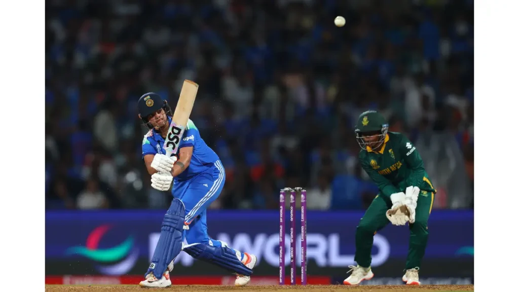 ভারতের ইনিংসে শুরুটা ছিল দাপুটে। শেফালি ও স্মৃতি মন্ধানা মিলে প্রথম ১০ ওভারে ৬৪ রান তোলে। মন্ধানা (৪৫) আউট হওয়ার পর কিছুটা ছন্দপতন হলেও শেফালি অর্ধশতক ছুঁয়ে দলকে বড় স্কোরের ভিত গড়ে দেন। শেষ দিকে বঙ্গসন্তান রিচা ঘোষের ২৪ বলে ৩৪ রানের ঝড়ো ইনিংসে ভারত প্রায় ৩০০ রানের লড়াকু স্কোর। সেমিফাইনালের অস্ট্রেলিয়ার বিরুদ্ধে জয়ের নায়িকা জেমিমা রড্রিগুয়েজ এ দিন ৩৭ বলে ২৪ রান করেন। দক্ষিণ আফ্রিকার পক্ষে মারিজানে ক্যাপ, খাকা ও দে ক্লার্ক প্রত্যেকে নেন দুটি করে উইকেট।