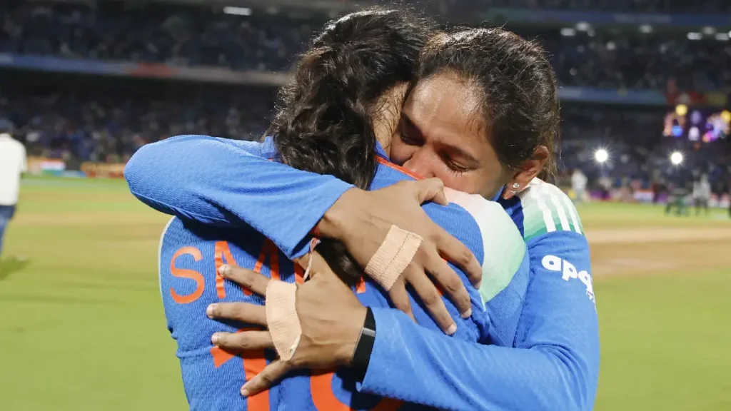 জয়ের আনন্দে একে অপরকে জড়িয়ে ধরেছেন অধিনায়ক হরমনপ্রীত এবং সহ-অধিনায়ক স্মৃতি। ছবি BCCI Women ‘X’ থেকে নেওয়া।